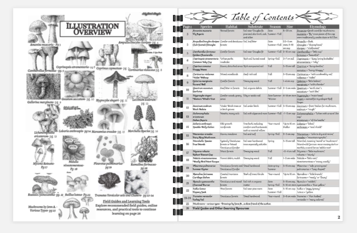 Featuring native fungal species hand-drawn by Stevi Brown during fieldwork for her Environmental Science degree and Mycology Certification at The Evergreen State College.