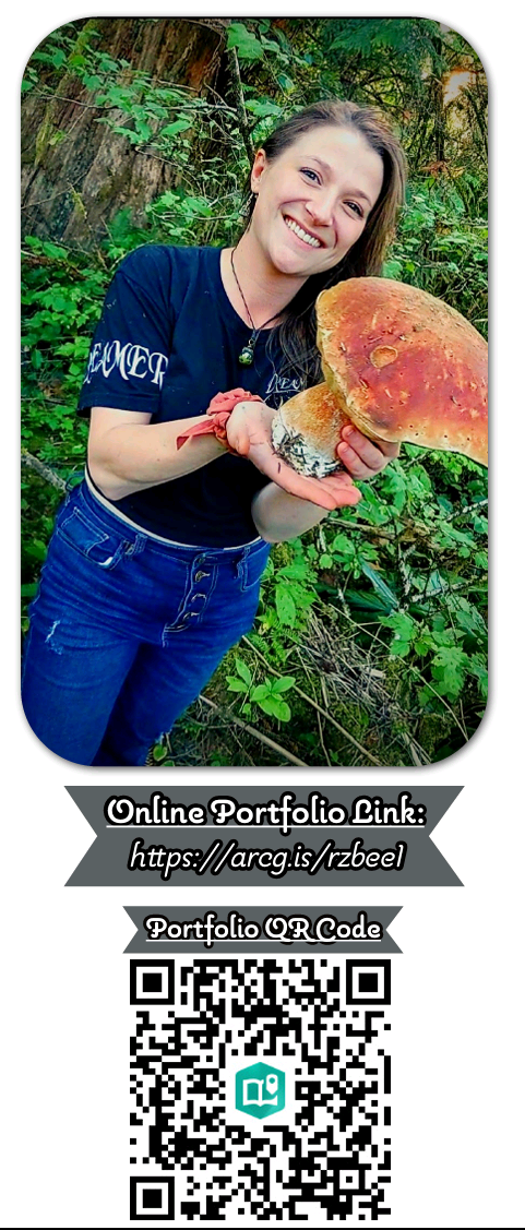 With a background in behavioral science and over a decade supporting neurodiverse individuals and families, she brings a collaborative, inclusive lens to education and outreach— through a lens that values precision, empathy, and shared learning. Her portfolio (listed below) includes further creations such as interactive mushroom and lichen maps, web map applications, outreach materials, public surveys, visual dashboards, and story maps—all designed to connect people to place through both science and art. To explore more of Stevi’s work, visit her online portfolio by scanning the QR code or copying the link provided above.